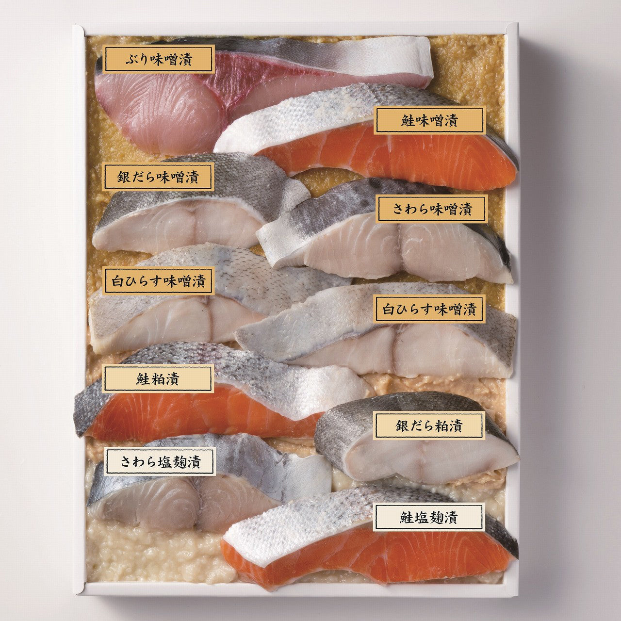 白ひらす味噌漬70g×2、ぶり味噌漬120g、鮭粕漬80g、鮭味噌漬80g、鮭塩麹漬80g、銀だら粕漬70g、銀だら味噌漬70g、さわら味噌漬70g、さわら塩麹漬70g